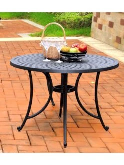 Designed for style and built to last, this dining table is solid-cast aluminum finished with a charcoal black powder coating that will weather the harshest of outdoor conditions.