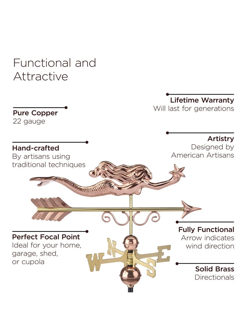 This mermaid couldn’t be happier to rise from the sea foam and adorn the rooftop of your home, garage, cupola, or gazebo. For over 35 years Good Directions Pure Copper Weathervanes have been unsurpassed in style, quality, and durability – perfect for the house-proud homeowner. Bring the Joy of Outdoor Livingâ„ to your home with this heirloom-quality piece. Easy-to-assemble and install. Includes weathervane figure, an assembly rod, solid brass 15″ L directionals and copper globes. Roof mount sold separately. The pure copper will age naturally over time.