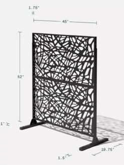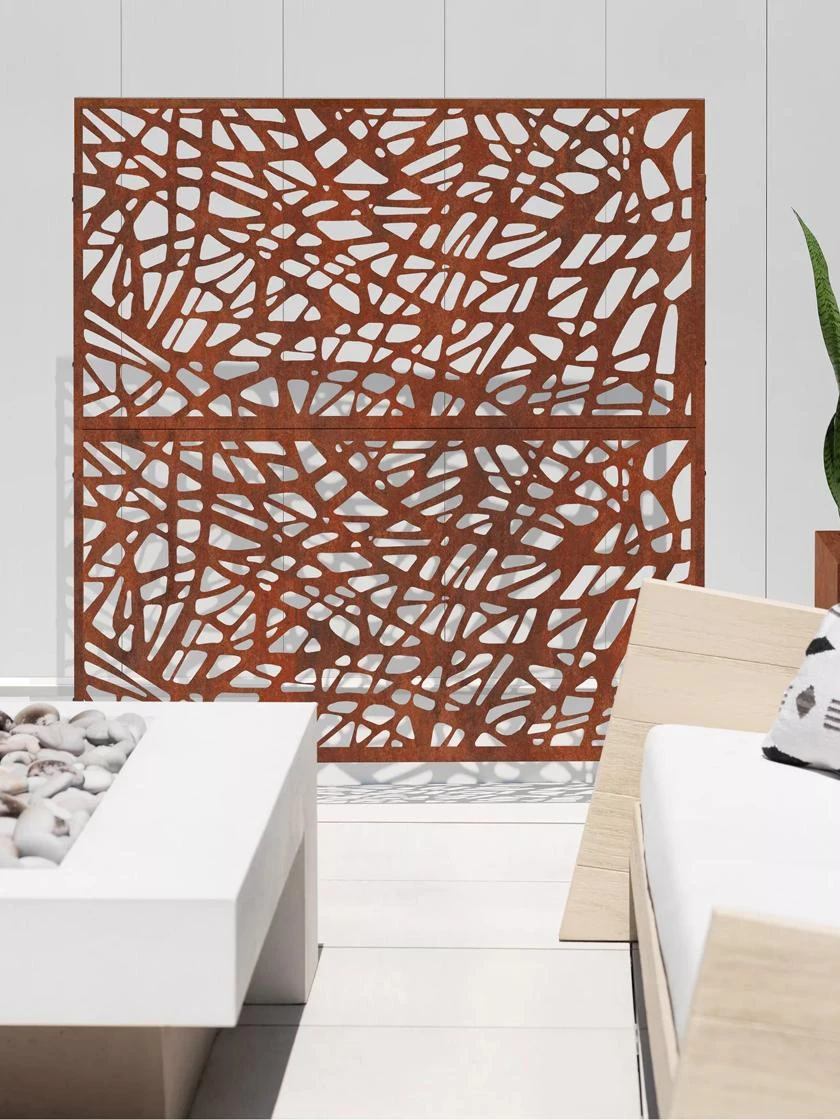 Privacy has never looked so good! Transform your backyard or deck with an outdoor two-panel privacy screen set. The abstract web design of this panel provides 65% privacy. Use it to hide an unsightly view, to block unwanted direct sunlight, create privacy or to frame an outdoor room. This screen is made from 1-1/2 mm laser cut steel designed to resist corrosion through all seasons. Solid, yet lightweight, the black galvanized steel screen is protected by a strong, scratch-resistant powder coating that is treated with UV inhibitors to minimize fading. The Corten steel screens are shipped in their raw steel state, gradually developing a rich rust patina finish over time.